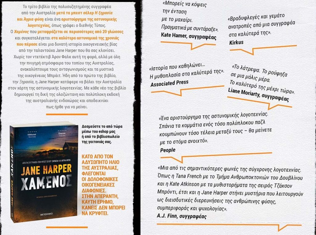 Μετά τα διεθνή μπεστ σέλερ Η Ξηρασία και Άγρια φύση, η Jane Harper από την Αυστραλία, επανέρχεται με το πολυαναμενόμενο θρίλερ Χαμένος. Με μια συναρπαστική πλοκή, με ανατροπές που κόβουν την ανάσα, με χαρακτήρες θυελλώδεις και με ένα αναπάντεχο τέλος, τίποτα σε αυτό το μυθιστόρημα δεν είναι προβλέψιμο. Ένα βιβλίο ωρολογιακή βόμβα που εκτοξεύει πλέον τη βραβευμένη συγγραφέα στους κορυφαίους της αστυνομικής λογοτεχνίας.