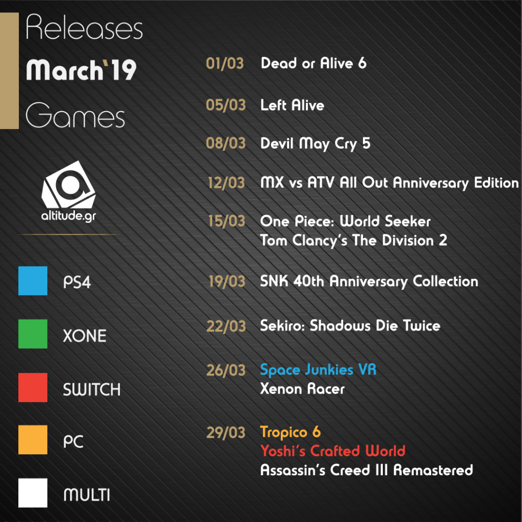 Σε αυτό το άρθρο συγκεντρώσαμε τις κυριότερες και μεγαλύτερες κυκλοφορίες παιχνιδιών για τον μήνα Μάρτιο. Η επιλογή των τίτλων έγινε με βάση τις οικιακές κονσόλες PS4 – XBOX ONE – SWITCH και PC. Κάντε κλικ πάνω στην εικόνα για να την δείτε σε μεγαλύτερη ανάλυση. Παρακάτω μπορείτε να δείτε trailer των παιχνιδιών για αυτό το μήνα.
